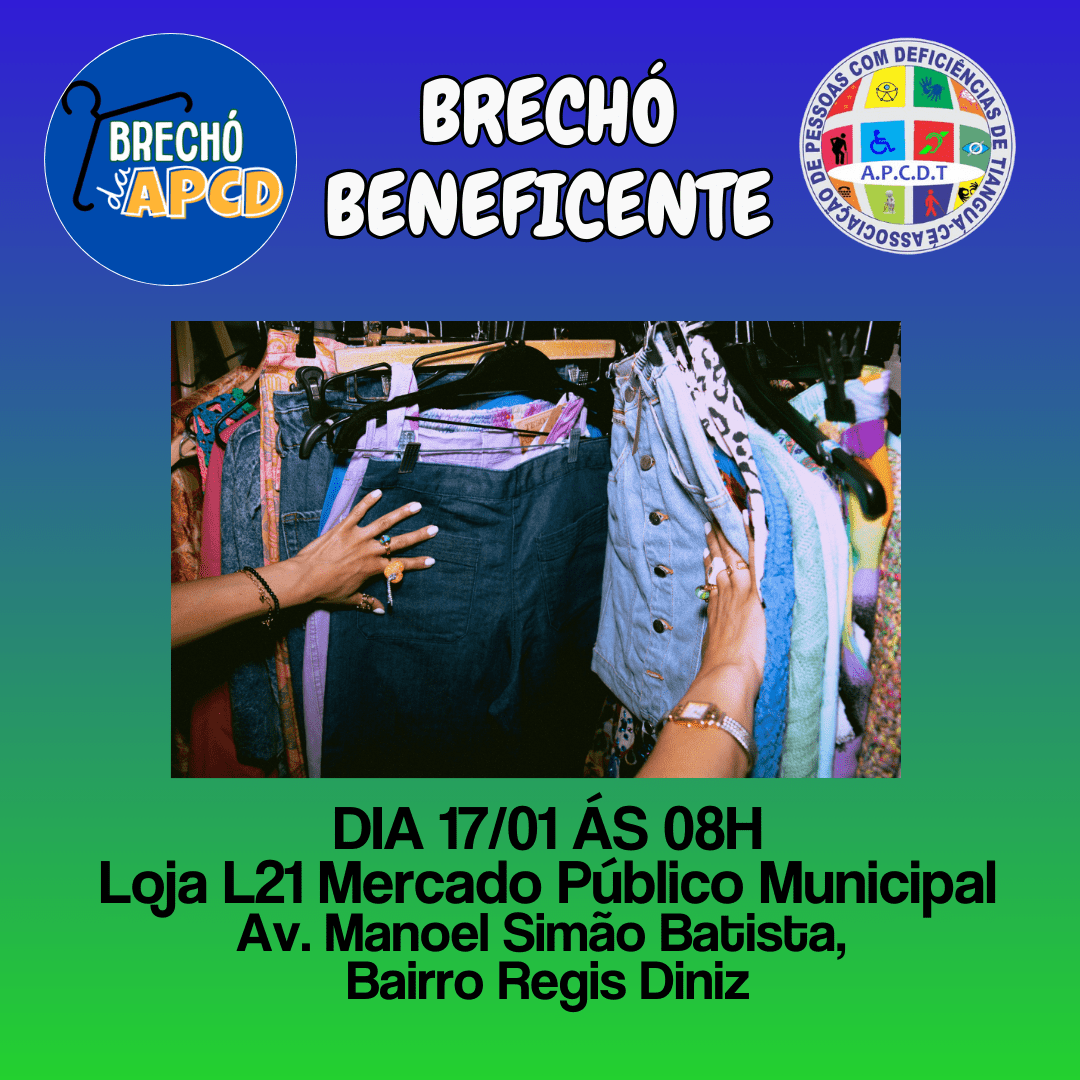 A Associação de Pessoas com Deficiência de Tianguá tem a alegria de convidar toda a comunidade para a reinauguração da sua Loja do Brechó Beneficente, que acontecerá no dia 17 de janeiro (sábado), a partir das 8h, no Mercado Público Municipal, Loja L21, localizada na Avenida Manoel Simão Batista / Avenida Régis Diniz, em Tianguá–CE.